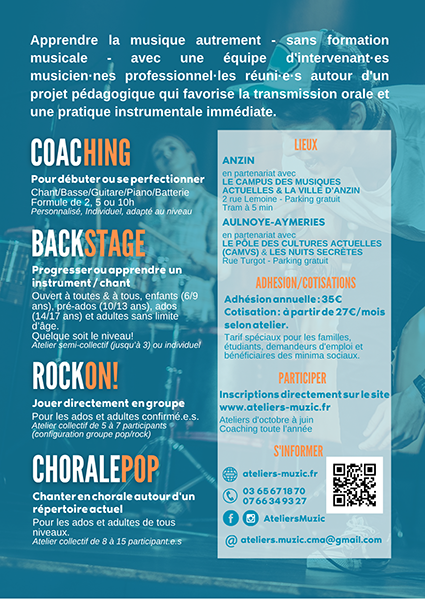 Les Ateliers Muzic c’est apprendre la musique autrement avec une équipe d’intervenant·es musicien·nes professionnel·les réunis autour d’un projet pédagogique qui favorise la transmission orale et une pratique instrumentale immédiate. C’est aussi un projet associatif qui porte haut les valeurs que véhicule la musique telles que l’échange, le partage et l’ouverture d’esprit.