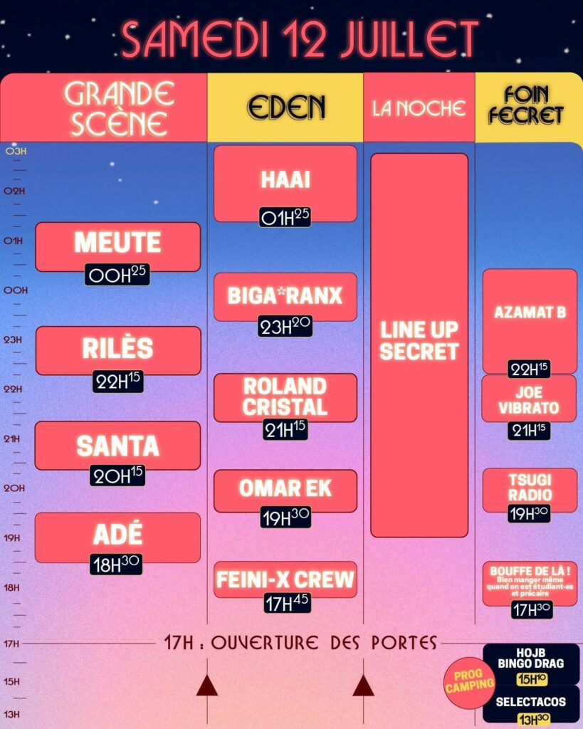 Du 11 au 13 juillet 2025, Aulnoye-Aymeries est le lieu de toutes les rencontres, l’endroit parfait pour partager, danser, s’amuser, se laisser bien volontiers surprendre et vibrer de concert face à La Grande Scène, Le Foin secret, L’Eden ou encore La Noche qui vous emmène au bout de la nuit à moins que ce ne soit au petit matin…. C’est là tout le savoir-fête des Nuits Secrètes, une façon d’être ensemble sans bouder son plaisir !