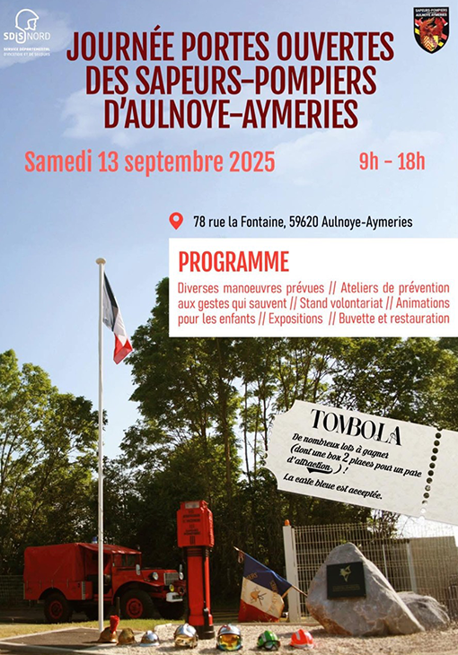 Samedi 13 Septembre, de 9 h 00 à 18 h 00, Journée portes ouvertes au CSI – Centre de Secours et d’Incendie d’Aulnoye-Aymeries.